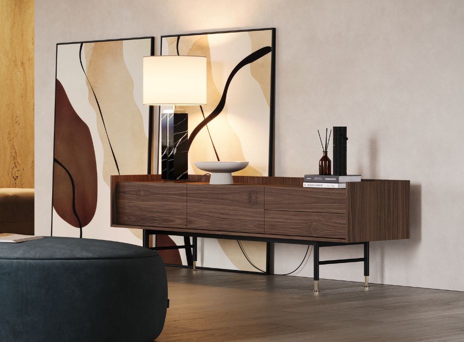 - Solid wood bases — used across tables and cabinetry — add warmth and structure. The Desmond TV Cabinet and minimalist sideboards showcase wood’s versatility, paired with black metal and metal accents for a contemporary edge.