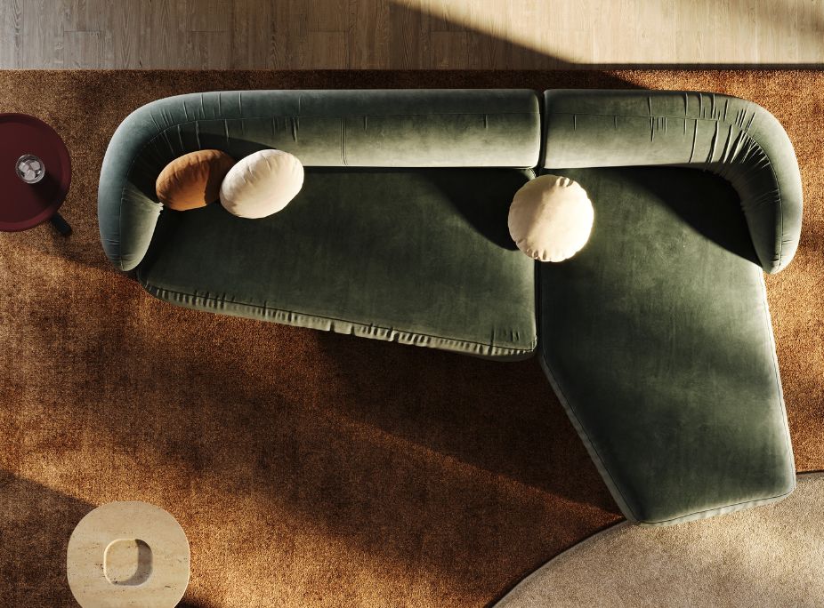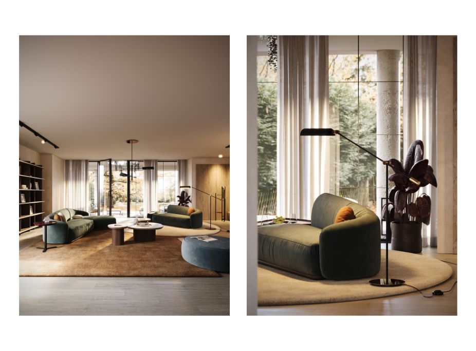 - Velvet upholstery, especially in deep green tones, dominates seating arrangements. The Amália Sofas and sectional pieces envelop the room in plush comfort, their curved silhouettes enhancing the sense of flow and serenity.