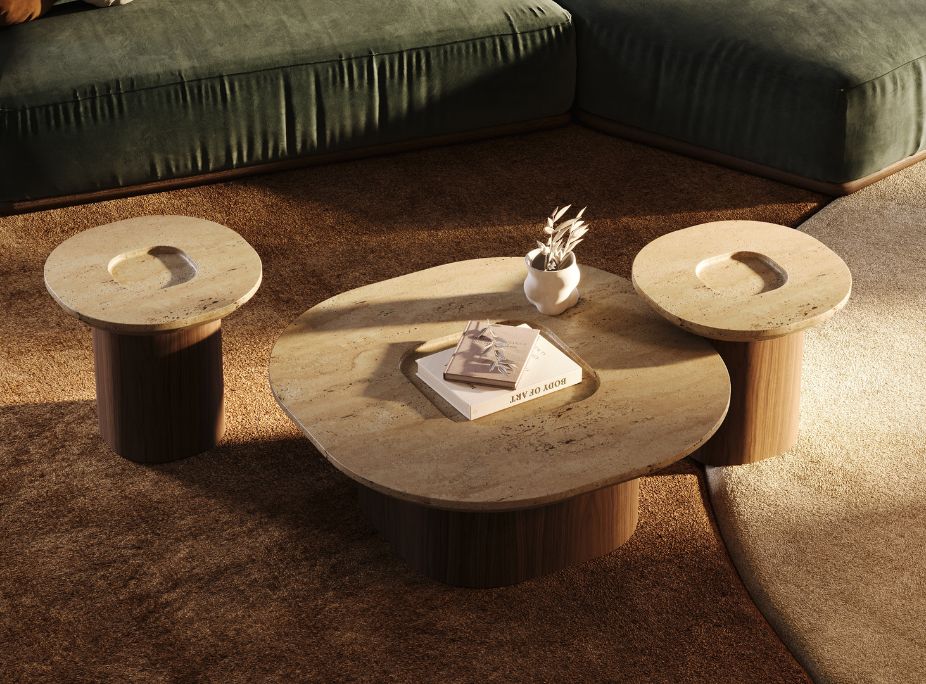 - Travertine stone features prominently in the Lao Coffee and Side Tables, offering porous textures that echo Brutalist influences while maintaining organic softness. These pieces, seen in multiple room settings, bring sculptural elegance and a sense of permanence.