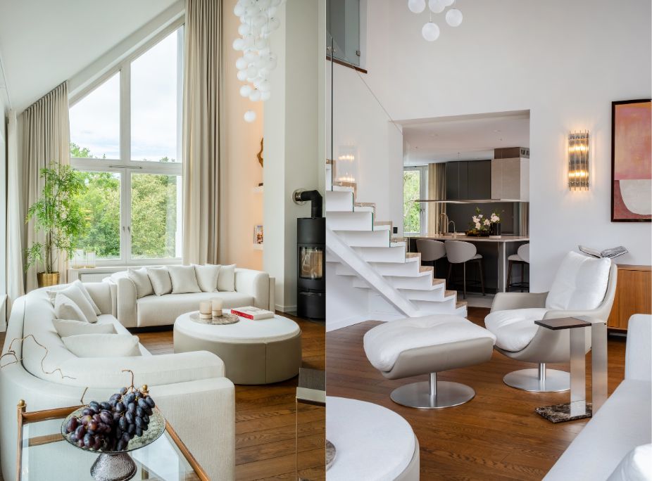 This sophisticated project, in Kaunas, by Elegant Home & Girstė Urbaitytė highlights the transformative power of custom design. The minimalist living room, furnished with an array of Laskasas pieces, such as the Wellington Sofa, Sophia Armchair and Poppi Side Table. It demonstrates how clean lines, a neutral palette, and customisation can create a space that is both modern and inviting.