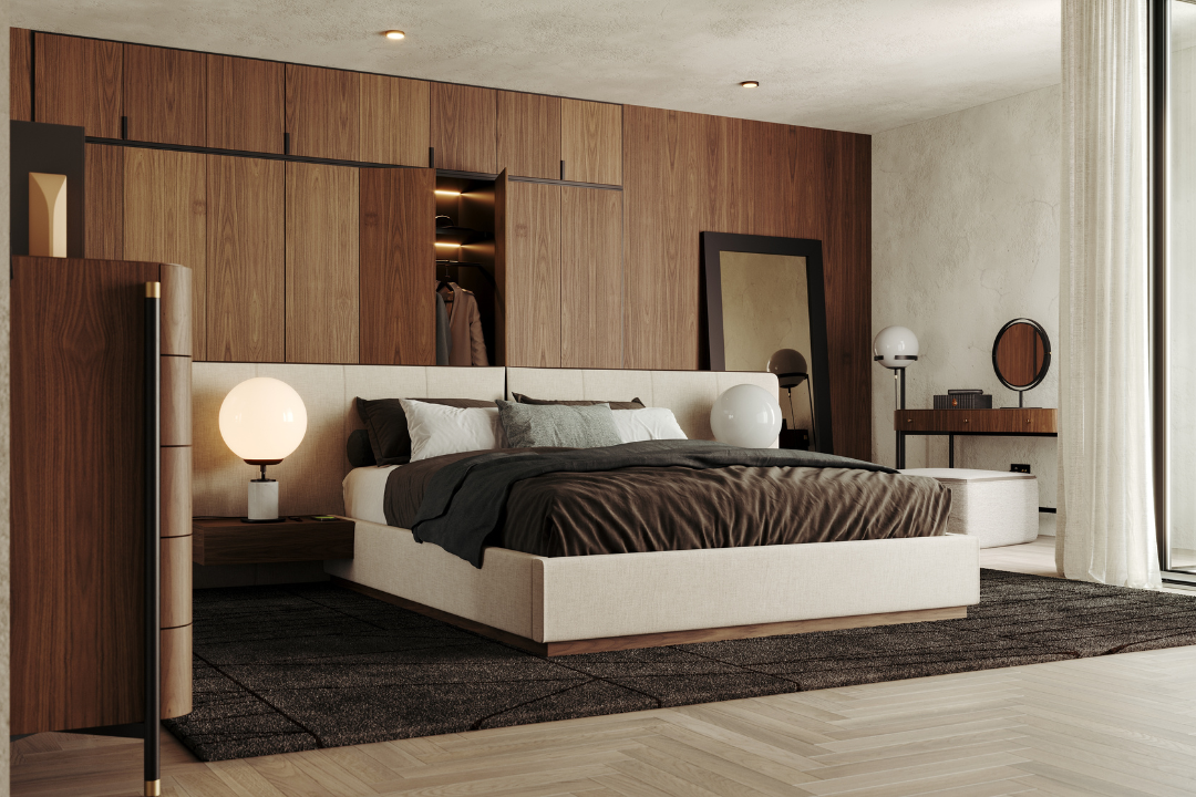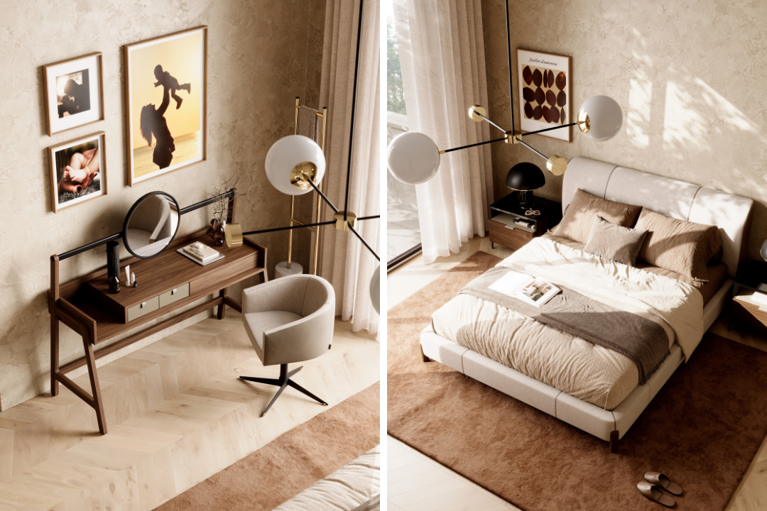 Dormitorio con Cama Thalia, Mesa Auxiliar Cap y Sillón George.