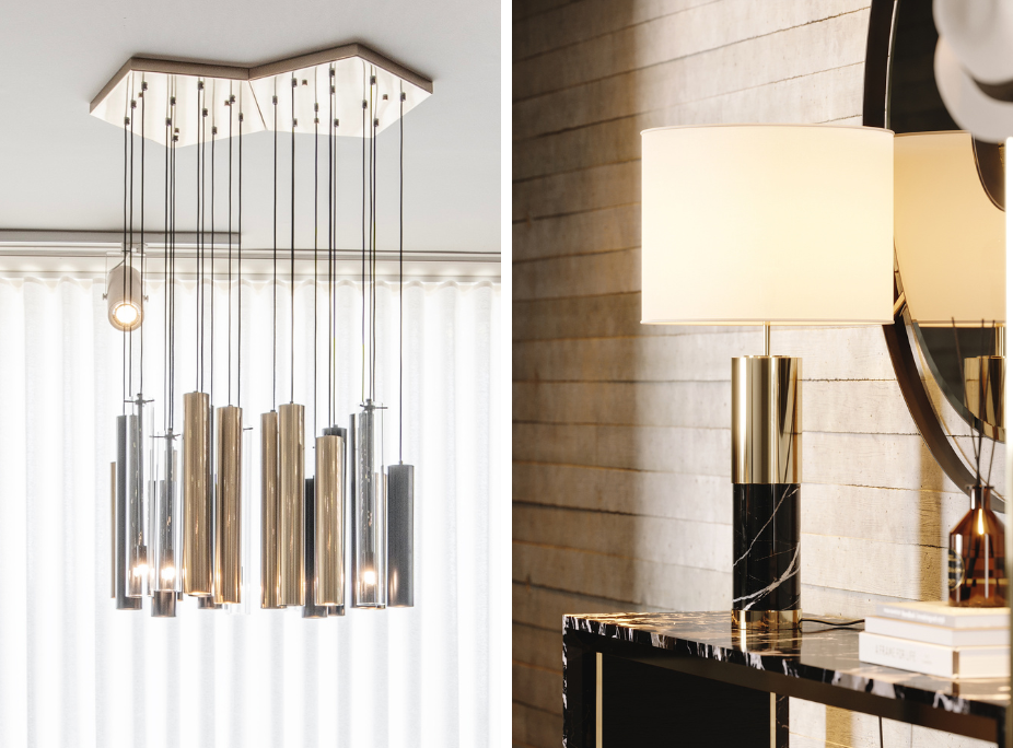 Candeeiro de Teto Jazz em Inox Dourado e Inox Polido, Candeeiro de Mesa Sharon em Inox Dourado e Mármore Nero Marquina