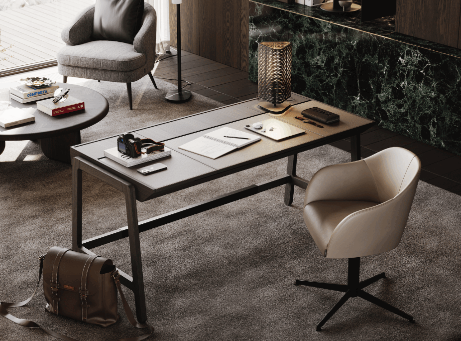Escritório da casa douro com iluminação de tarefa criada por Candeeiro de Mesa Walker e Candeeiro de Pé Evans, acompanhados por bastante luz natural