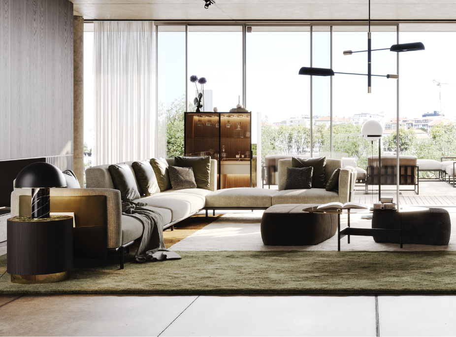Sala de estar da casa Douro com Candeeiro de Teto Randolph, Candeeiro de Mesa Franklin, iluminação integrada no Móvel de Bar Morrison e luz natural