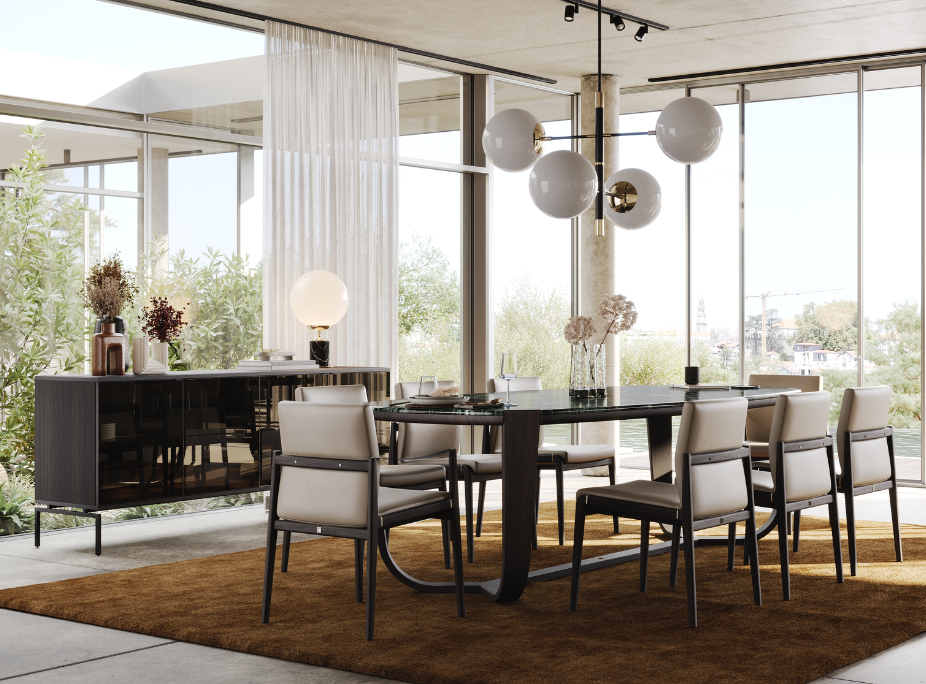 Sala de jantar em tonalidades escuras, equilibrada com bastante luz natural, Candeeiro de Teto Randolph, Candeeiro de Mesa Clark e Aparador Austin com LEDs integrados