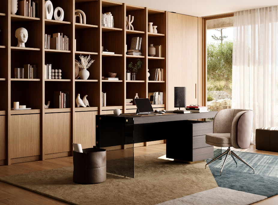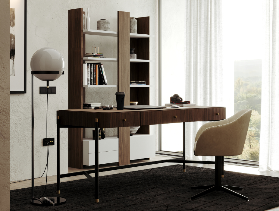 Escritório com Secretária Larson, Estante Biel e Candeeiro de Mesa Walker.