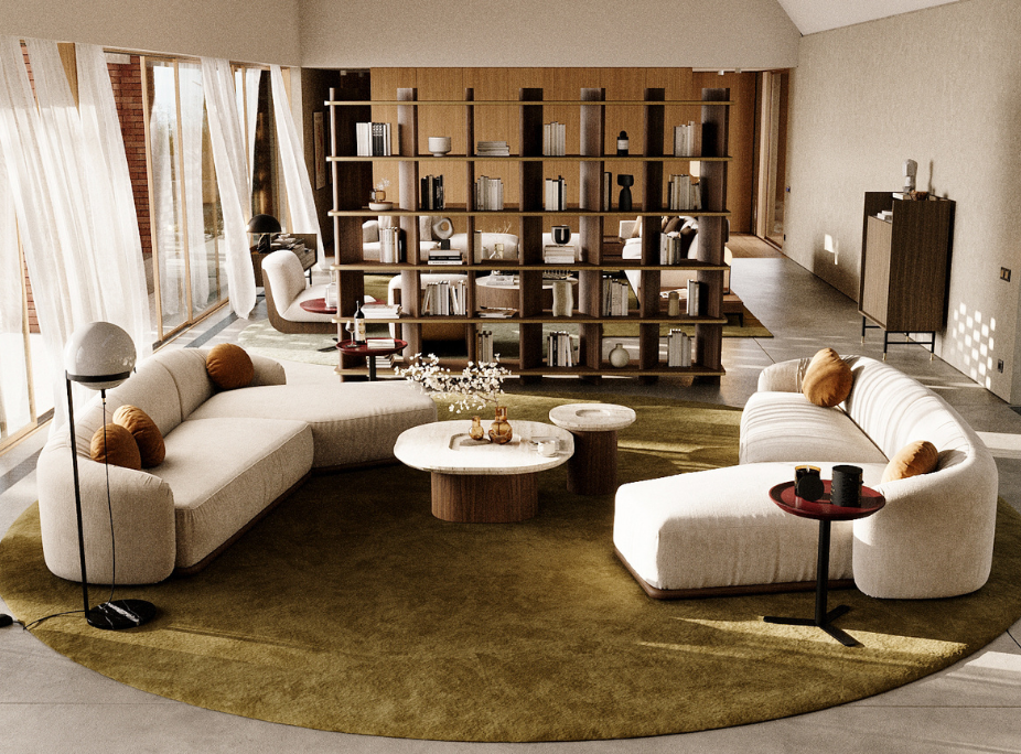 Sala de estar com Estante Mandela, Sofá Modular Amália e Mesa de Centro Lao.