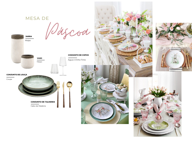 Se a sua mesa é em formato redondo , a melhor forma de atrair atenção é focando-se no centro da mesa. A minha sugestão passa por colocar uma jarra com flores (jarra maipo) e alguns artigos relativos à Páscoa como umas amêndoas, que promovam mais suporte a esta composição. No que respeita ao serviço de mesa, deverá envolver a mesma com um conjunto de pratos e talheres mais elegantes e ter em atenção o serviço de copos que vai escolher, indo sempre ao encontro da bebida que será degustada aquando da refeição (veja os diferentes conjuntos de copos aqui).