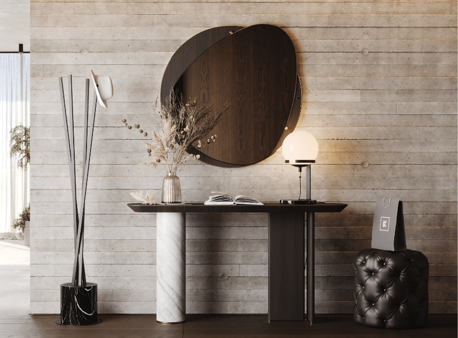 Hall de entrada com Consola Samos, Puff Zephir, Espelho Forth e Candeeiro de Mesa Jude.