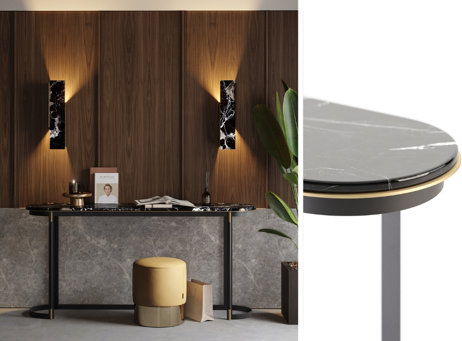 Hall de entrada com Consola Lyssa, Puff Isaac, Candeeiro de Parede Dave e detalhes da Consola Lyssa.