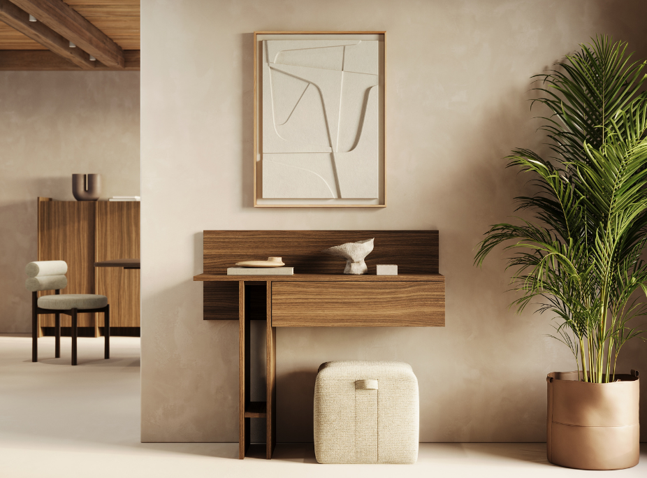 Hall de entrada com Consola Eos Retangular, Puff Sphinx e Candeeiro de Mesa Walker.