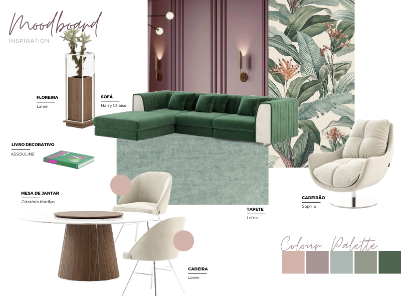 Moodboard de inspiração para a primavera com Floreira Lanie, Sofá Harry Chaise, Livro Decorativo, Mesa de JantarMarilyn, Cadeira Loren, Tapete Leiria e Cadeirão Sophia