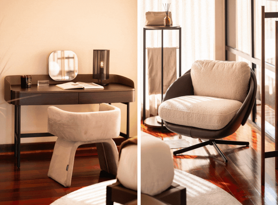 A Cama Clare, a Banqueta Albert e o Cadeirão George oferecem conforto e versatilidade, sempre com uma estética elegante. Ao seu lado, as Mesas de Cabeceira Pema acrescentam espaço de arrumação e completam o visual criado. Por último o Toucador Pema e a Cadeira Yasmin criam a zona perfeita para se aprontar antes de sair de casa.
