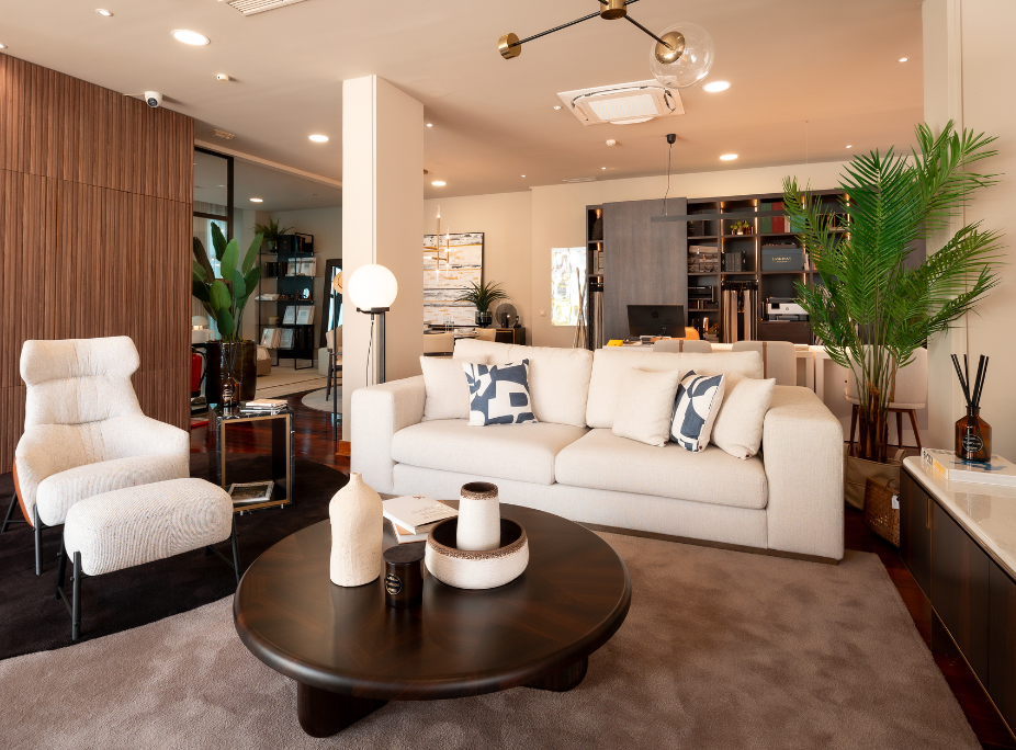 Sala de estar da Loja Laskasas do Estoril com Sofá Charlie, Mesa de Centro Williams e Cadeirão Hubert.