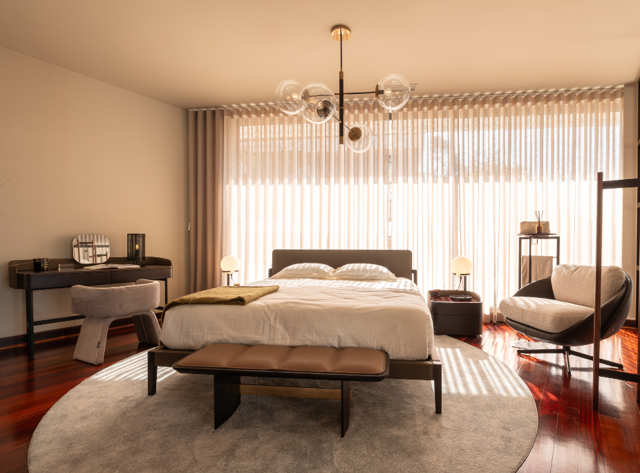 Quarto na Loja Laskasas do Estoril com Cama Clare, Banqueta Albert, Cadeirão George, Mesa de Cabeceira Pema, Toucador Pema, Cadeira Rotativa Yasmin e Candeeiro de Teto Meredith.