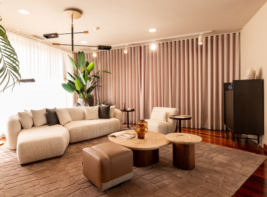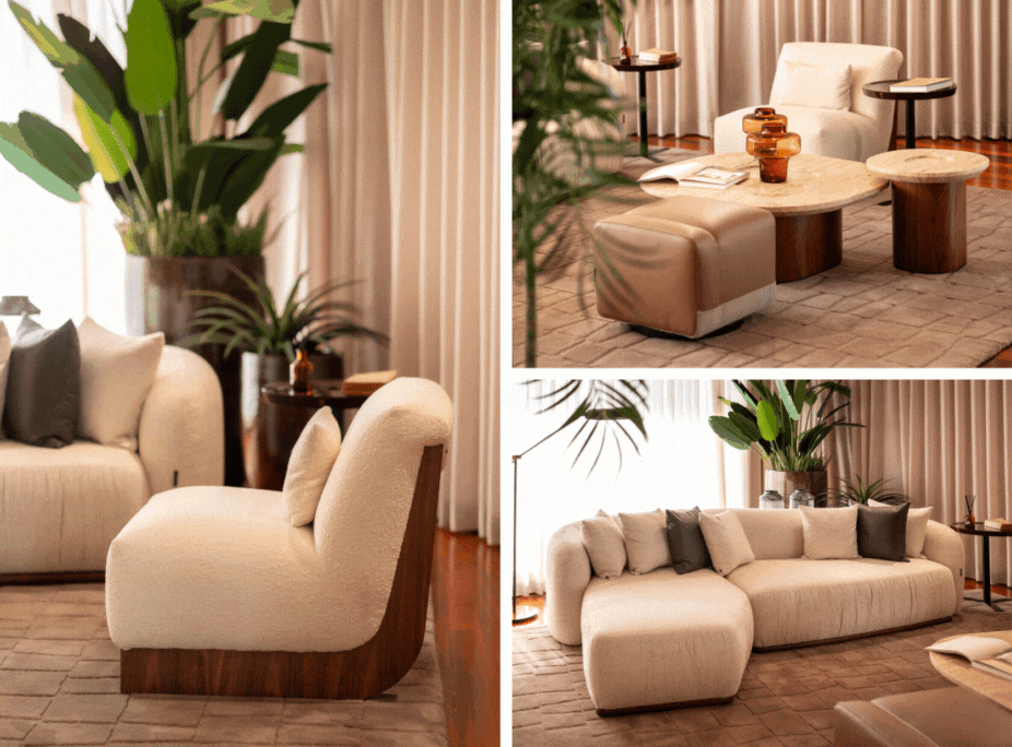 Um ambiente contemporâneo, repleto de linhas orgânicas, luz natural e com uma paleta neutra, suave e aconchegante.