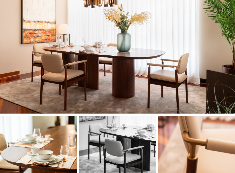 A sala de jantar combina elegância discreta e funcionalidade, com peças que celebram o design intemporal. A Mesa de Jantar Kahlo, com detalhes em mármore e metal, é o ponto de encontro perfeito para refeições memoráveis. As Cadeiras Ava com Braços garantem o conforto e requinte da divisão, aspetos indispensáveis para qualquer ocasião.
