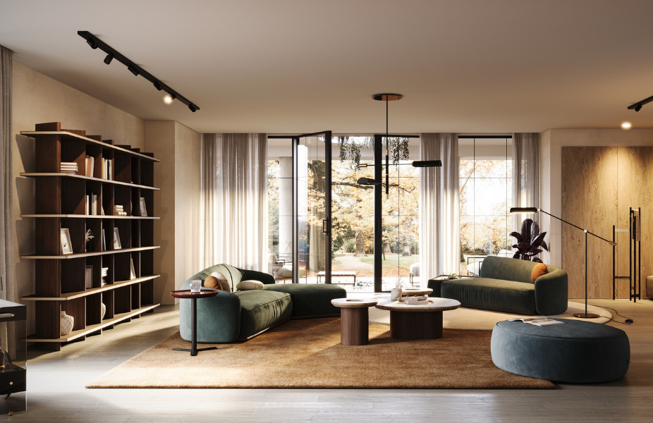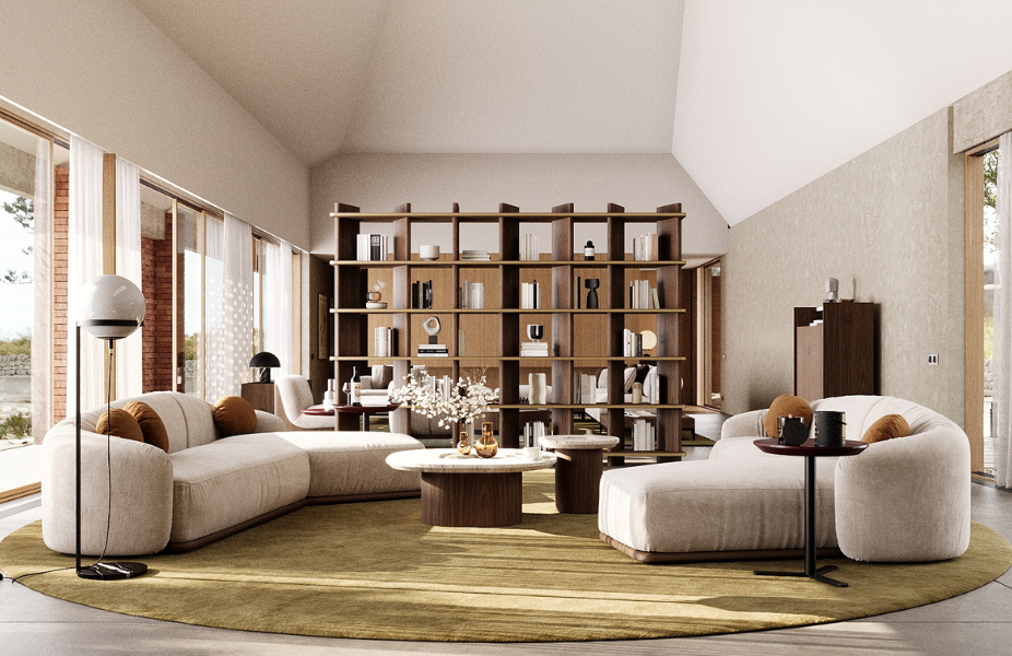 Sala de estar com Sofás Amália, Estante Mandela, Mesa de Centro Lao e Mesa de Apoio Lao.