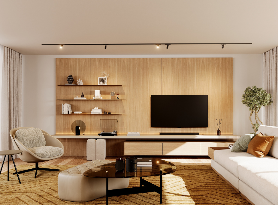 Se tiver televisão, a largura do móvel deve possui mais de 20 cm que a largura do ecrã (pelo menos 10 cm de cada lado) para garantir equilíbrio visual. A altura de ambos deve estar ajustada de forma a que o centro do monitor se encontre à altura dos seus olhos quando se senta no sofá.
